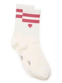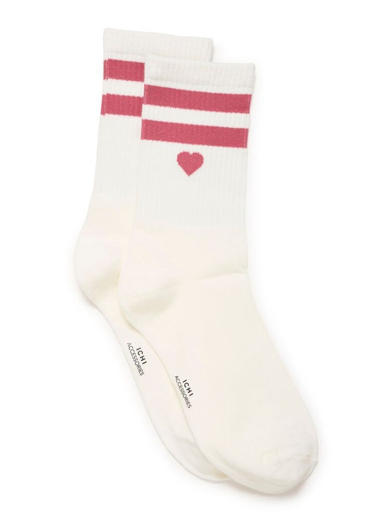 Calcetines Ichi, 20124955 IAMIO SO, fondo blanco con detalle de rayas y corazón en color rosado.