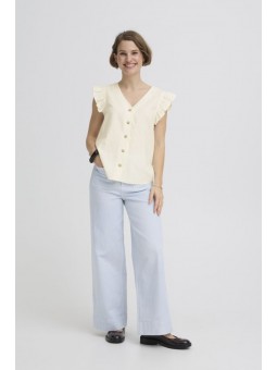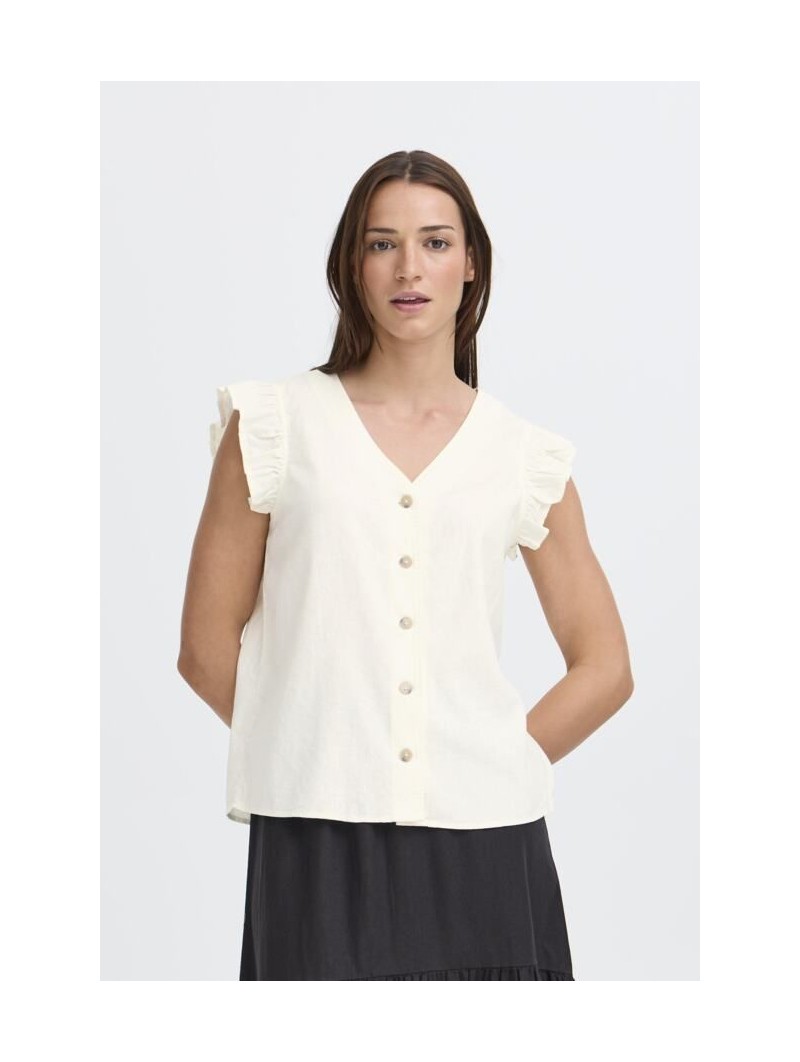 Top Byoung, 20816604 BYFALAKKA RUFFLE SHIRT, con cuello pico sin mangas pero con detalle de volantes en la sisa. Cierre con 5 botones en la parte central delantera. Largo a cadera, puedes llevarla por fuera o metida por dentro de una falda o pantalón.