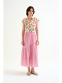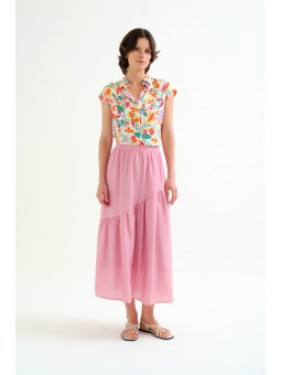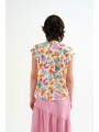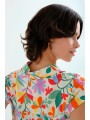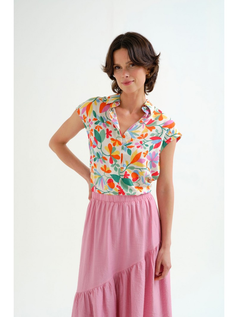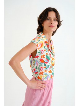 Camisa Compañía Fantástica, 62C/12107 SHIRT, con cuello solapa y manga corta. Esta camisa con estampado lotto de flores de colores sobre fondo blanco roto tiene cierre en la parte central delantera con botones ocultos con una solapa. La modelo mide 177cm y lleva la talla S.