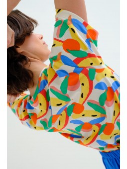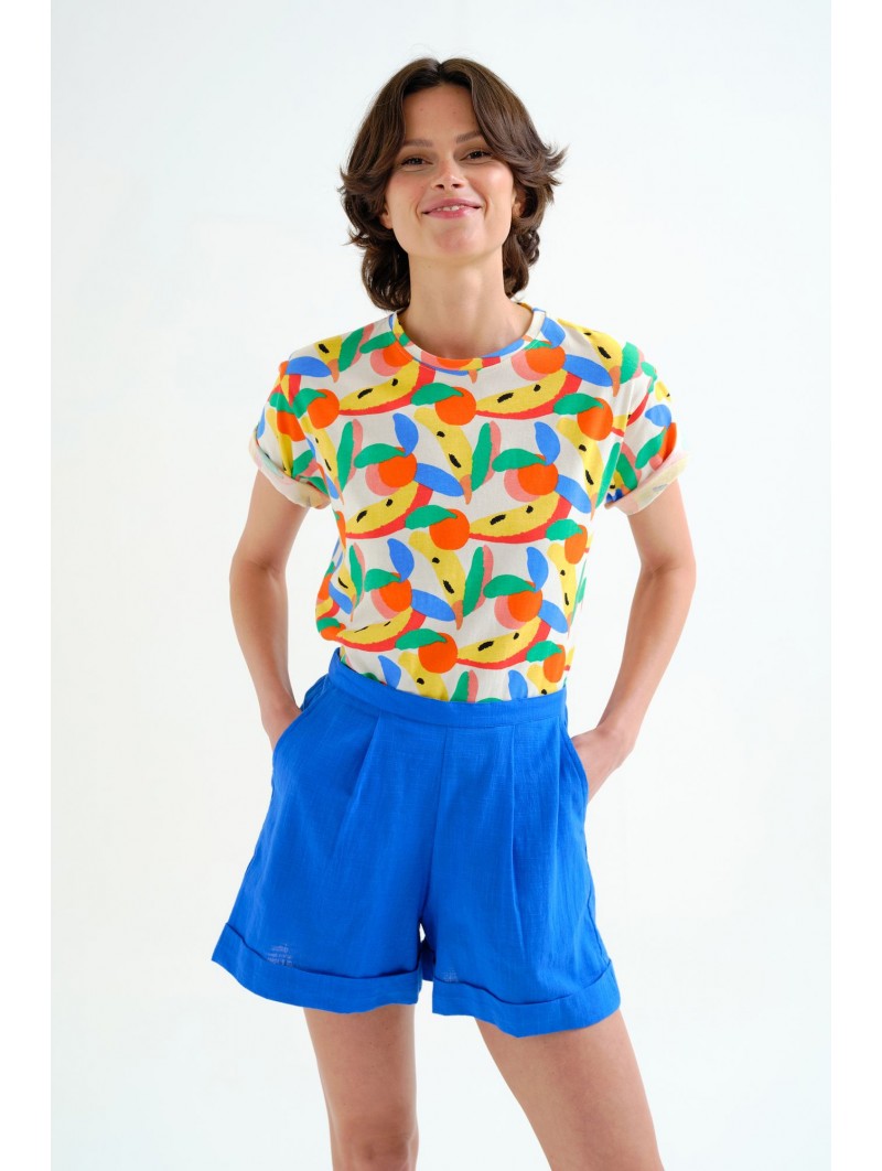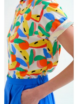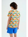 Camiseta Compañía Fantástica, 62C/42117 T-SHIRT, de cuello redondo y manga corta con vuelta en el bajo de la manga. Estampado tutti frutti small de frutas de colores. La modelo mide 177cm y lleva la talla S.