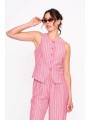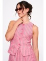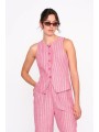 Chaleco 24Colours, 12480A, en color rosa con cuello redondo y cierre con 5 botones en la parte central con abertura al final. Detalle de rayas verticales triples y costuras para definir la prenda.