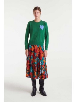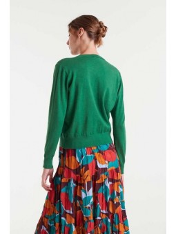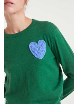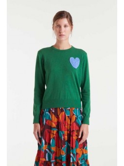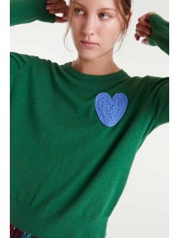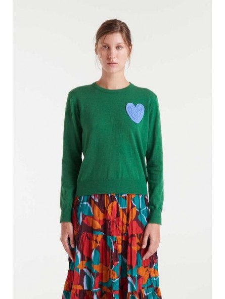 Jersey Compañía Fantástica, 53C/10219, con cuello redondo y manga larga en un color verde súper favorecedor con detalle de print bordado en color azul en el lado izquierdo zona pecho. Detalle de canalé en cuello, puños y bajo del jersey. La modelo mide 1,77cm y lleva la talla S.
