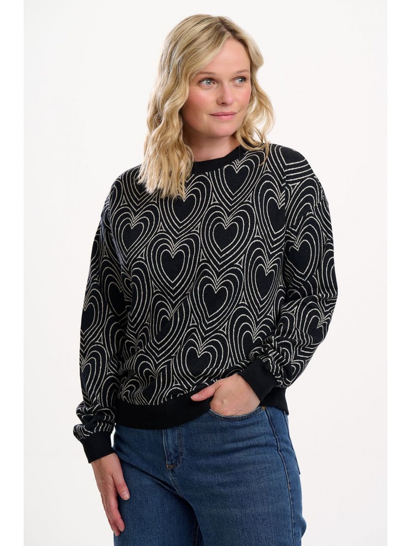 Jersey Sugarhill Brighton, T1009 GERRI JERSEY JACQUARD TOP, de cuello redondo y manga larga con rib en cuello, puños y bajo del jersey. Estampado de multi corazón lineal en blanco sobre fondo negro.