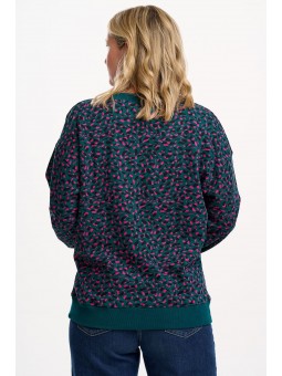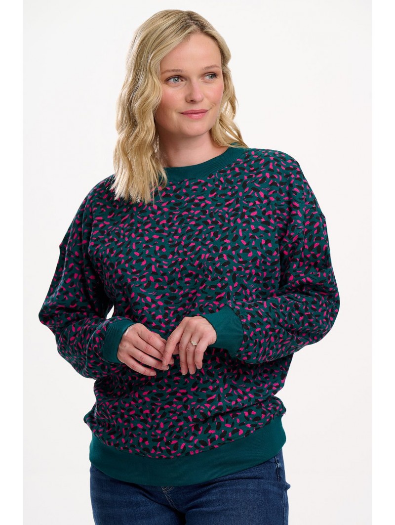 Sudadera Sugarhill Brighton, SW0180 EADIE RELAXED SWEATSHIRT, con cuello redondo y manga larga esta sudadera relajada, atrevida e irresistiblemente suave, la sudadera oversized Eadie está confeccionada en jersey de algodón 100% orgánico para ofrecer la máxima comodidad. Esta sudadera hipoalergénica de cuello redondo presenta un estampado abstracto inspirado en el leopardo con manchas dispersas en negro y rosa sobre un fondo verde azulado profundo. Los hombros caídos y el ajuste oversized crean una silueta relajada, mientras que el interior súper suave lo hace perfecto para usar todo el día. Combínalo con jeans o joggers para un día fresco fácil.