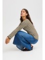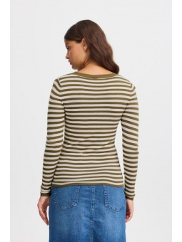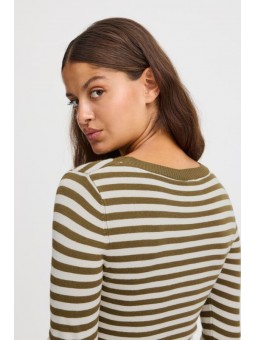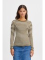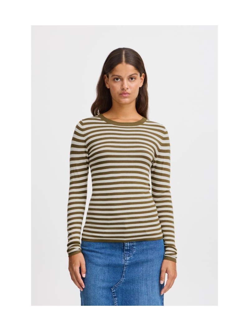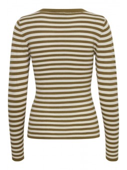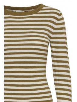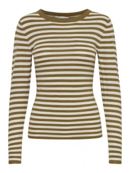 Jersey finito Ichi, 20121496 IHDIANE LS, de cuello redondo y manga larga con un estampado de rayas horizontales en color kaki sobre fondo beige.
