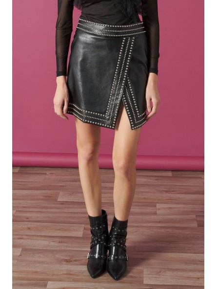 Falda Minueto, 242283 POP SKIRT, de tiro alto con cruce en la parte delantera y detalle de tachuelas de diferentes medidas en cinturilla, bajo y cruce delantero de la falda. Forro interior 100% poliéster. La modelo mide 1,78m y lleva la talla S.