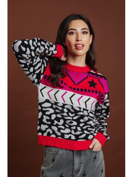Jersey Minueto, 242305 MIMMO SWEATER, con cuello redondo y manga larga con detalle de rib en cuello, puños y cintura. Largo del jersey a cadera. Estampado mix con animal print, estrellas y formas geométricas. La modelo mide 1,70m y lleva la talla S.
