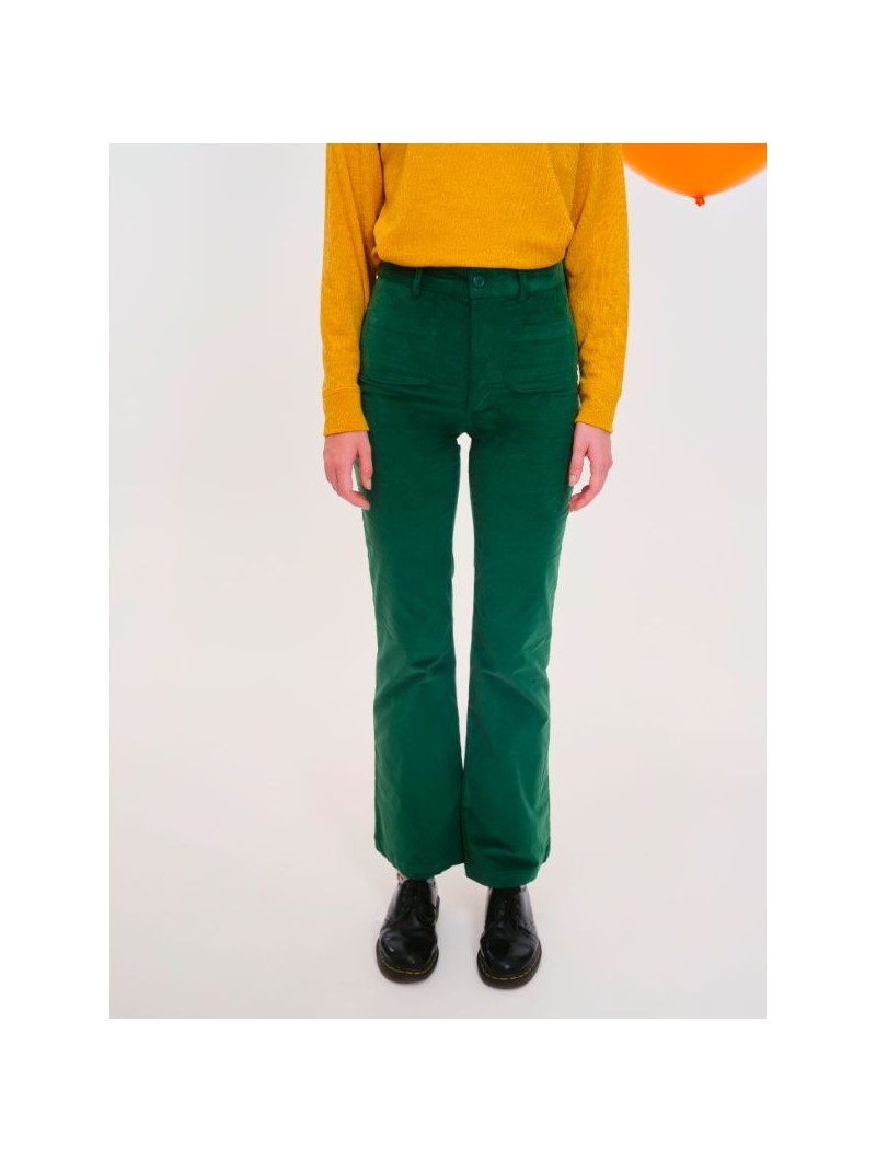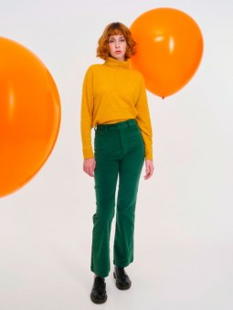 Pantalón Béhulah, CECILIA, de cintura alta con tejido de micropana de algodón y largo recto. Detalle de bolsillo de plastón en el delantero. La modelo lleva una talla S.