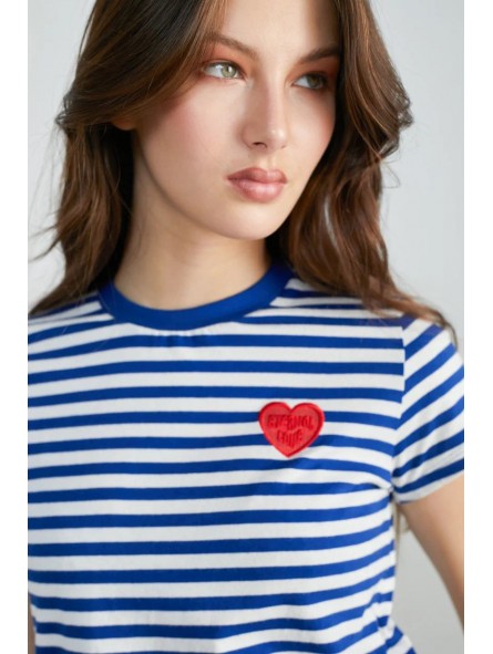 Camiseta 24Colous, 12296 TSHIRT, de cuello redondo y manga corta con corte slim con detalle de rayas horizontales y corazón bordado en rojo. disponible en rayas negras, rayas verde y rayas azul eléctrico sobre fondo blanco.
