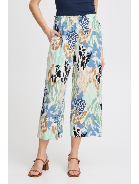 Pantalón culotte Fransa, 20613667 FRRELAX CU1, con goma nido de abeja en la cinturilla y bolsillos en los laterales del delantero. Estampado de formas abstractas y animal print en azules, verde y tierras sobre fondo blanco roto.