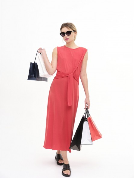 Vestido Béhulah HYAMS disponible en rojo y negro. Vestido de punto recto con largo midi con aberturas en los laterales y pinzas en la espalda. La parte del delantero lleva dos piezas de tejido que se cruzan creando un efecto drapeado que estiliza la figura. Un vestido que puedes llevar para un evento pero también para el día a día. La modelo lleva la talla S.