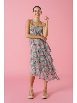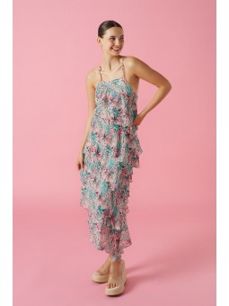 Vestido Minueto 241213 CALISTA DRESS, de largo midi con volantes y bajo asimétrico. Escote cuadrado en el delantero con tirantes finos regulables y cruzados en la espalda. Cremallera invisible en el lateral. Estampado floral en tonos turquesa y rosa pastel.