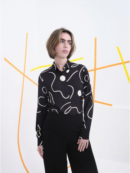 Camisa Béhulah, FORD LINEAL, con corte recto con cuello camisero y manga larga con puño. Un corte clásico de la marca que en este año presenta un estampado líneas de formas orgánicas y líneas que evocan el trazo libre el dibujo a mano. Detalle de botones en la parte central delantera con solapa para ocultar los botones. Puedes llevarla cerrada tipo camisa o abierta para llevar con un top debajo a modo de sobrecamisa.