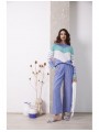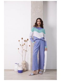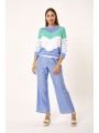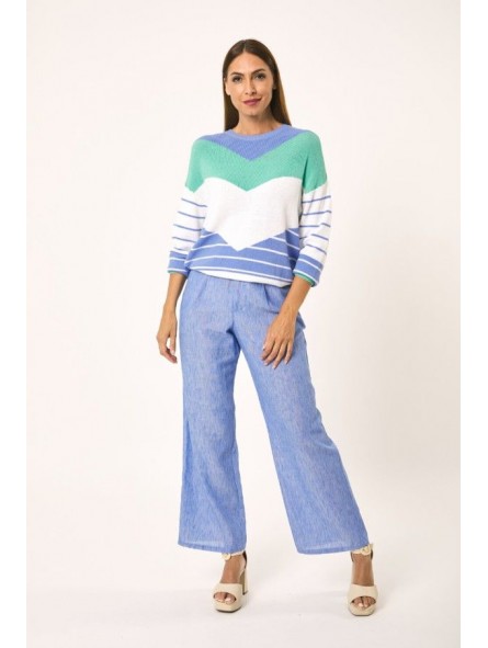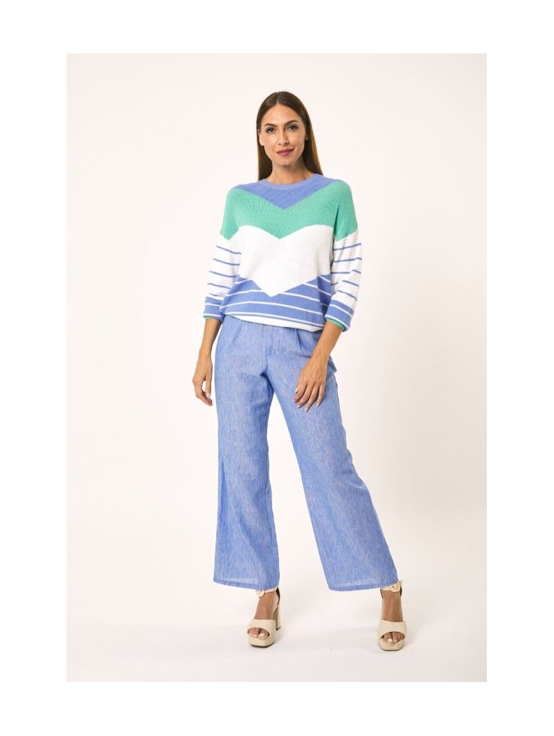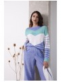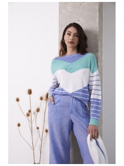 Jersey Lylu, S2619101 MAR SWEATER, de cuello redondo y manga larga con franjas en V en color blanco, azul y turquesa. Un jersey con un tacto muy agradable y ideal para llevar con tejanos en primavera.