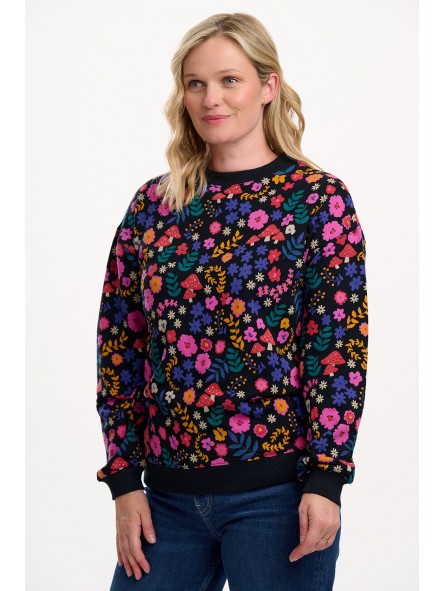 Sudadera Sugarhill Brighton, SW0181 NOAH SWEATSHIRT, con cuello redondo confeccionada en un corte semi-relajado con un interior cepillado súper suave, perfecto para el uso diario. Diseñado con un caprichoso patrón floral y de setas con colores vibrantes sobre un fondo negro, que evoca una mágica sensación de jardín boscoso, este jersey aporta un toque divertido y romántico a tu ropa de estar por casa o a tu armario informal. Completo con un escote, puños y dobladillo acanalados, el Noah es un básico de declaración que usarás durante toda la temporada.