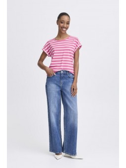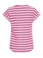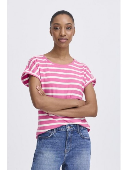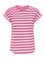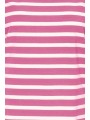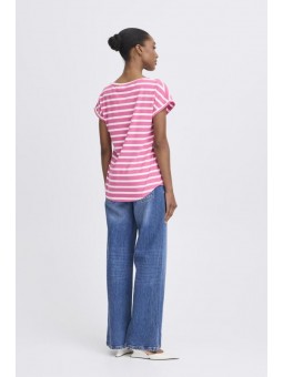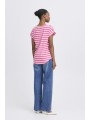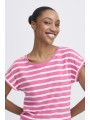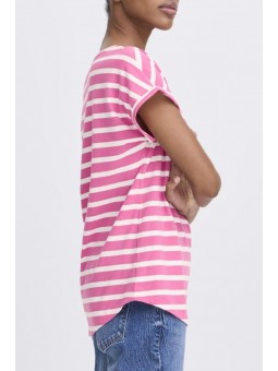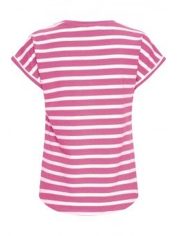 Camiseta Byoung, 20809561 BYPAMILA ONECK T-SHIRT, de cuello redondo con manga corta con vuelta en el bajo. Bajo redondeado en la parte delantera y trasera. Estampado de rayas blanco con fondo fucsia.