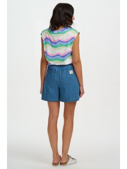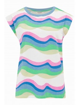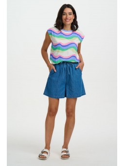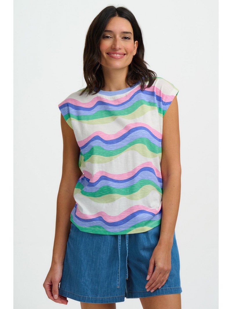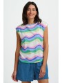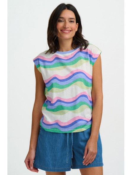 Camiseta Sugarhill Brighton, T1045 CHRISSY RELAXED TANK T-SHIRT, con cuello redondo sin mangas. Una camiseta de corte más anchito y patrón cuadrado. Estampado de ondas horizontales en colores pastel.
