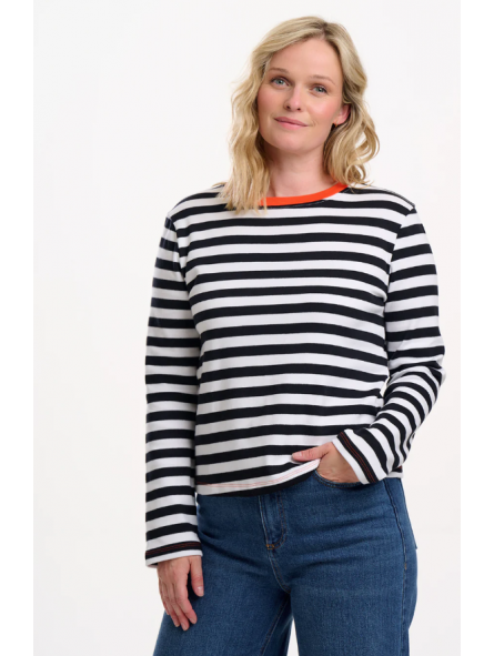 Camiseta Sugarhill Brighton, T0902 VIENNA JERSEY TOP, con rayas blancas y negras. Esta clásica camiseta bretona de manga larga presenta rayas horizontales atrevidas en un suave tejido de punto, rematado con un llamativo escote en contraste en naranja vibrante para darle un toque divertido. El ajuste relajado y el cuello redondo lo convierten en una prenda de capas sin esfuerzo para jeans, faldas o una blazer, perfecto para días informales y ropa de fin de semana.