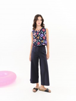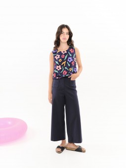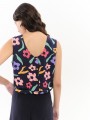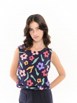 Top Béhulah, SAMIL FLORES, con estampado de flores de colores y fondo azul marino con cuello redondo sin mangas con detalle de cutouts en forma de onda en el bajo a la altura de la cintura. Espalda escotada con botones. La modelo lleva una talla S.