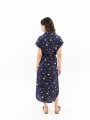 Vestido Béhulah, ALMA, de largo midi y camisero con manga corta caída y girada en el bajo. Este vestido es amplio para poder ajustar y ablusonar con un cinturón del mismo estampado y tejido. Cierre con botones en la parte central delantera. Disponible en fondo azul marino y fondo azul claro. La modelo lleva la talla S.