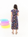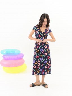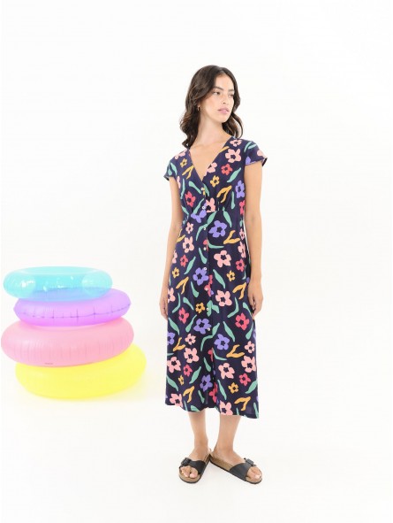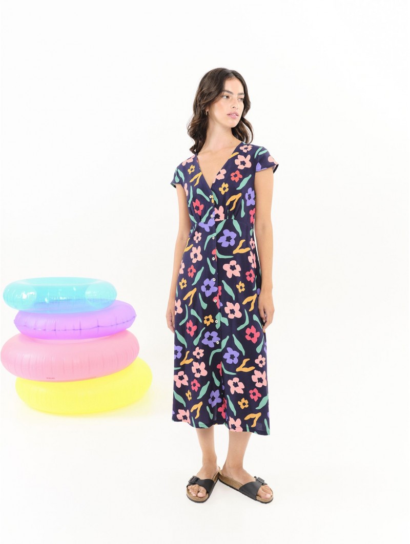 Vestido Béhulah, AURORA, con largo midi y escote en pico con manga corta. Corte en el pecho con fruncido en la parte baja del pecho. Cierre con botones en la parte central delantera. Disponible en 3 colores: Fondo coral con figuras, fondo azul eléctrico con figuras y fondo azul marino con flores colores. La modelo lleva una talla S.