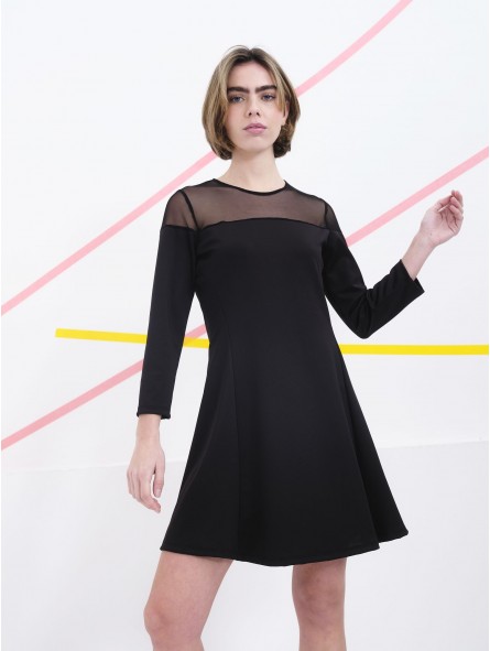 Vestido corto Béhulah, MIYAZAKI, que se ajusta al cuerpo gracias a su tejido elástico y con corte evasé en la falda creando un movimiento fluido y sofisticado. Detalle de tul transparente en el escote y hombros y el resto de la manga es igual que el vestido del cuerpo. Una prenda ideal para un evento o para un look más urbano.