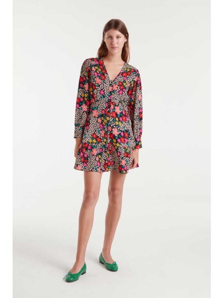 Vestido corto Compañía Fantástica, 53C/41009 SHORT DRESS, con tejido estampado Giardino, cuello pico y manga larga con puño. Cierre en la parte frontal delantera con botones, detalle de costura con fruncido en el pecho y volante en el bajo falda. Forro interior.