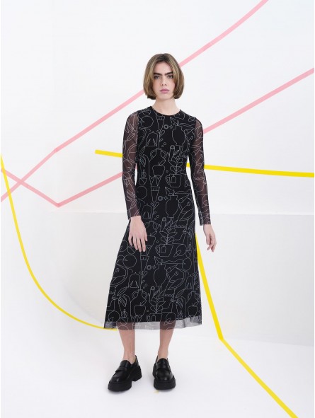 Vestido midi Béhulah, LYNCH, de cuello redondo y manga larga confeccionado en tul negro con estampados lineales en blanco con forro interior en el cuerpo y mangas transparentes. El estampado es obra de la ilustradora Judit Canela, un estampado que aporta una narrativa visual única y expresiva. La combinación de transparencia, textura y gráfica convierte esta prenda en una declaración artística y ideal! para quienes buscan vestir con identidad y expresión a la hora de vestir.